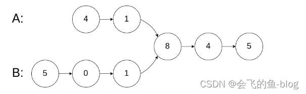 从各自的表头开始算起,链表 A 为 [4,1,8,4,5],链表 B 为 [5,0,1,8,4,5]。
