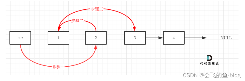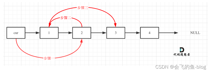 初始时,cur指向虚拟头结点,然后进行如下三步: