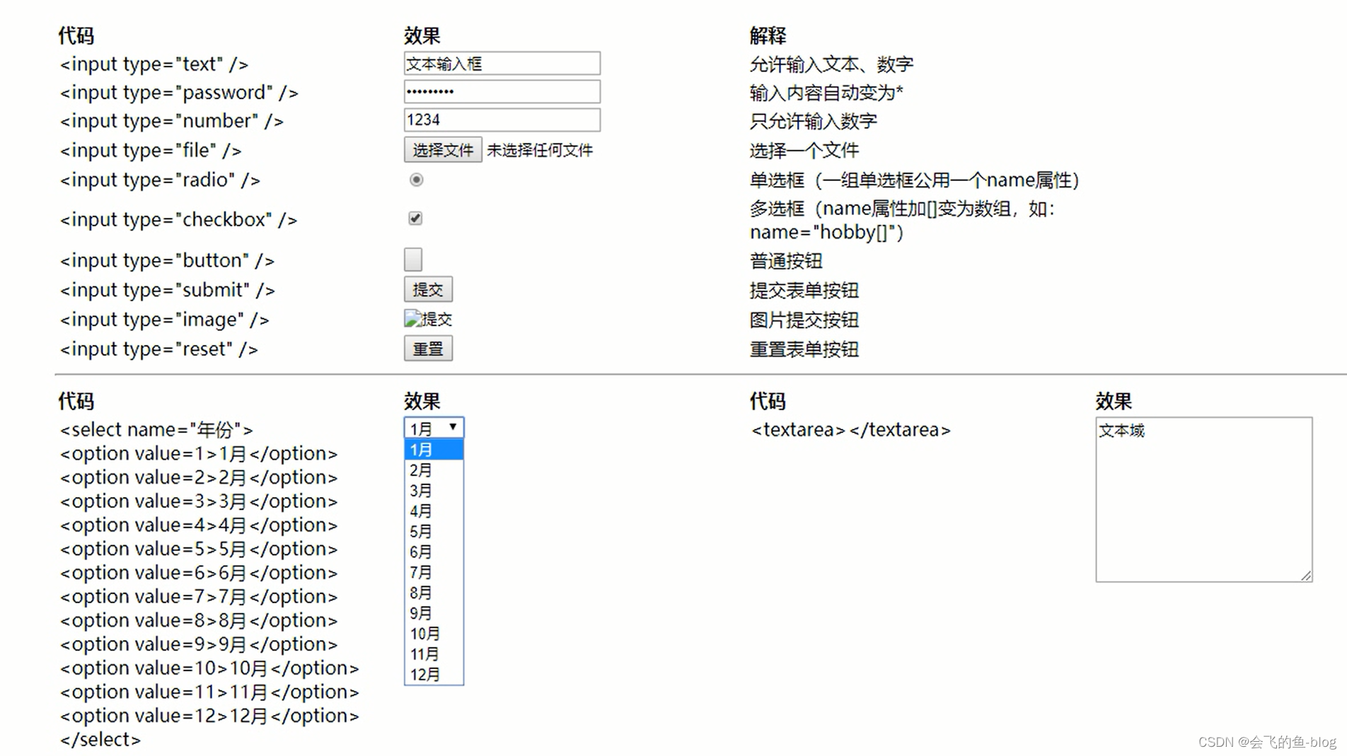 表单域:包含了文本框、密码框、隐藏域、多行文本框、复选框、单选框、下拉选择框和文件上传框等。