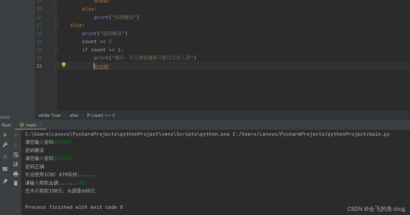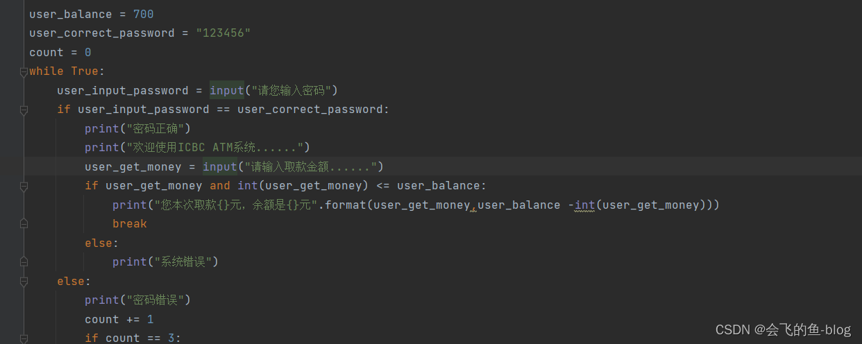 2.ATM机输密码,账户余额为:700元,正确密码为:123456,要求密码错误三次后提示卡已被锁请联系银行工作人员,如果密码正确则进入系统,然后提示用户输入取多少钱,如果账户余额大于用户输入余额则打印您本次取现xxx元成功,余额为xxx元,如果账户余额小于用户输入的金额则打印您的账户余额不足。