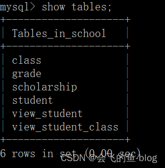 下面演示通过SHOW TABLES语句查看数据库school中的视图和表的功能,具体SQL语句如下,执行结果如下图所示。