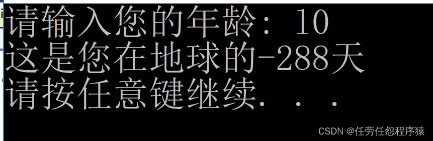 cout << "请输入您的年龄: "; cin >> age; cout << "这是您在地球的" << num <<"天" << endl; system("pause"); return 0; } |