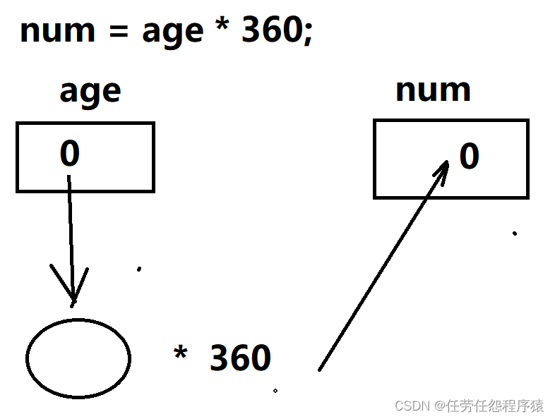 而不是数学中的理解: num永远是age的360倍【不适用于C、C++】