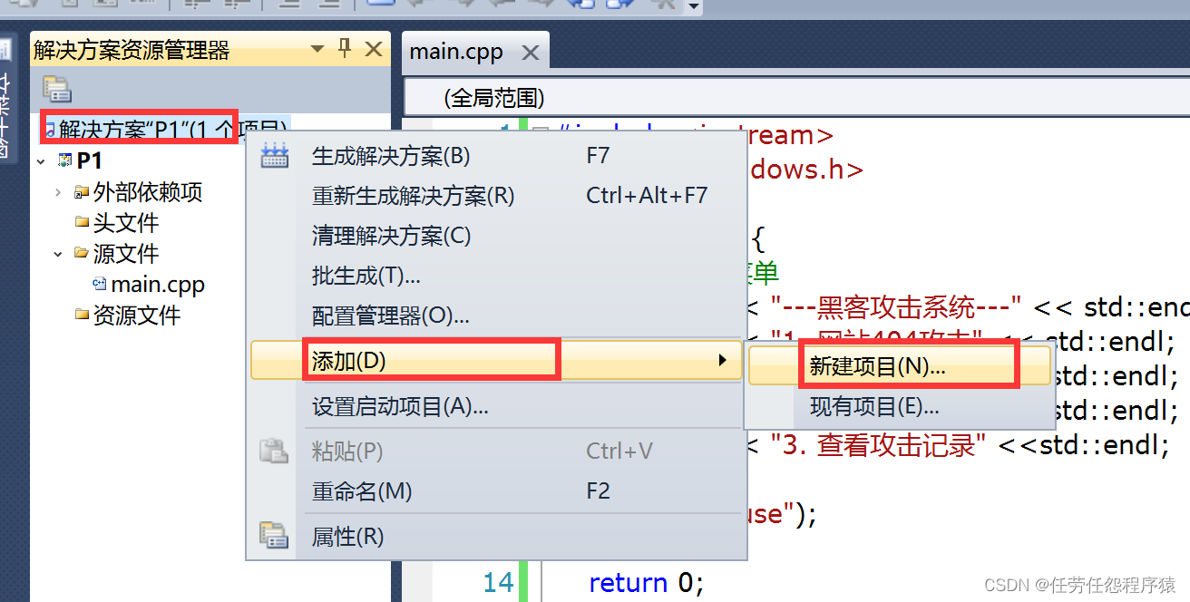 创建一个新项目(也可以重新创建一个新的解决方案)右击解决方案,选择“添加”> “新建项目”: