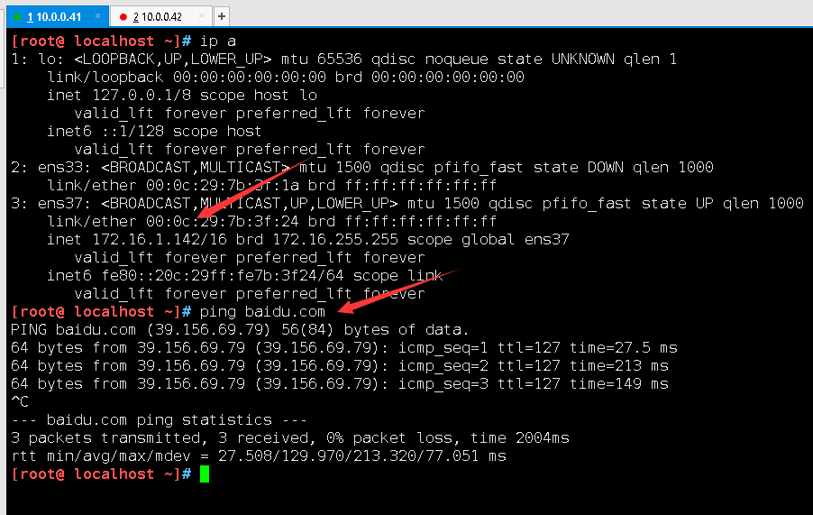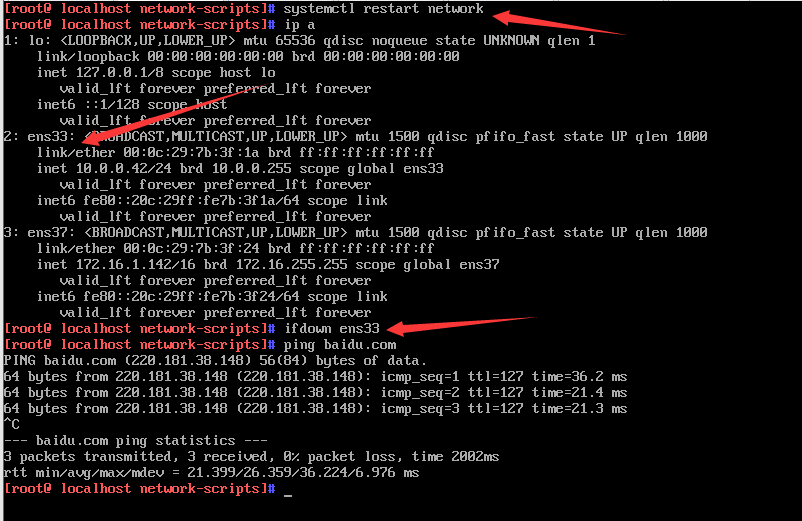 注:重启网卡会把ens33网卡重新启动,模拟效果在次关闭(ifdown ens33) 在ping百度