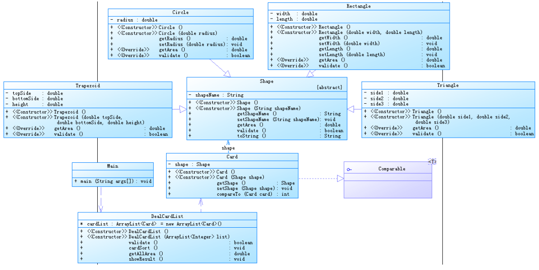 基于给出的类设计分析,思路主要是使用到继承和多态。对于题目卡片形状,抽象出一个Shape的抽象父类,里头定义了形状名称、形状的面积求法等(抽象定义,不实现)。又题目给出了明确的“卡片”定义,所以有一个卡片的类,当然卡片最主要的属性就是它的形状了,这都没什么好纠结的。题目给出了具体类设计,我们只需要按照类图去写代码就可以了,基本不会遇到什么问题。这里唯一需要注意的点就是在计算面积的时候,题目给出了“保留两位小数”的要求。当遇到这样的要求的时候一定要警惕,比如后面让你求和的时候,必须要注意到底是先保留两位再求和还是先求和再保留两位小数。