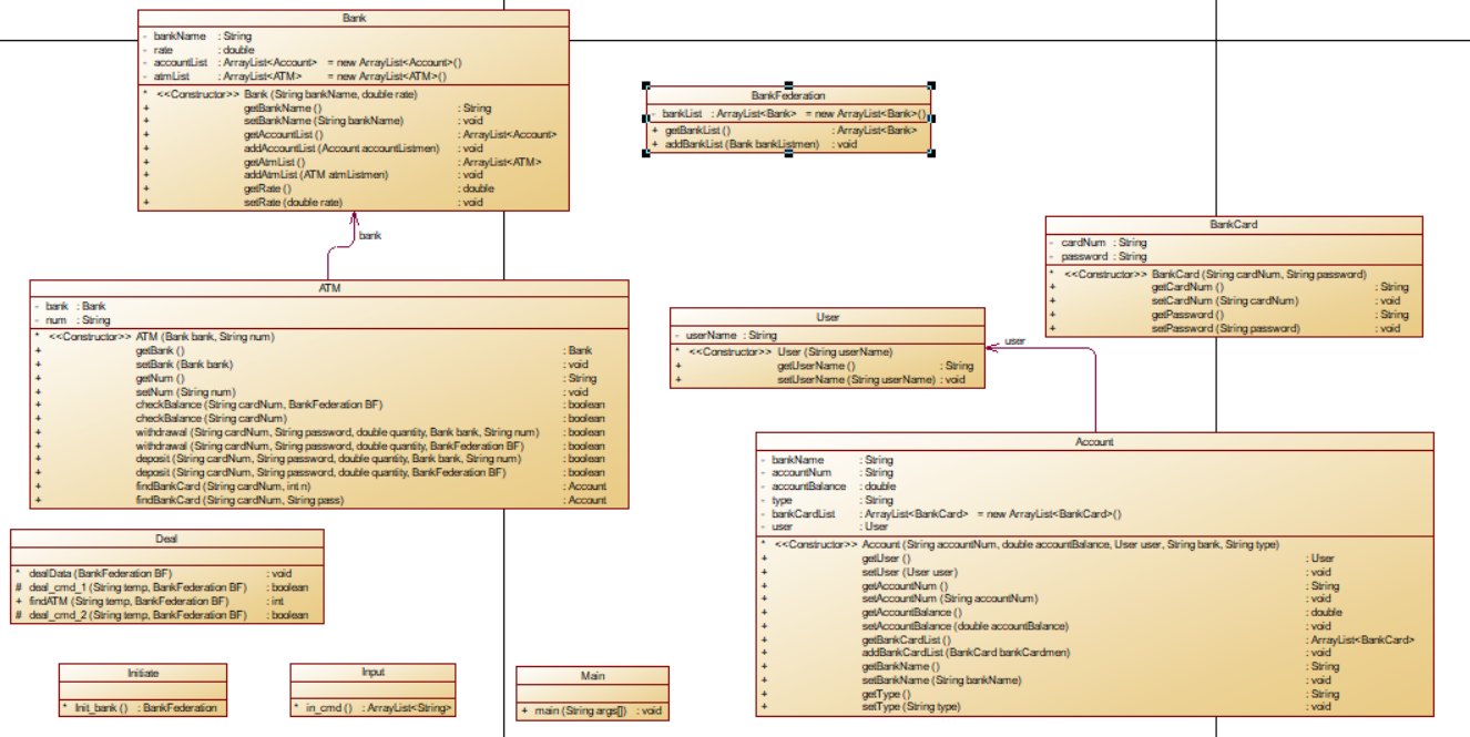 1 import java.util.ArrayList; 2 import java.util.Scanner; 3 public class Main { 4 public static void main(String[] args) { 5 // TODO Auto-generated method stub 6 BankFederation BF = Initiate.Init_bank(); 7 Deal.dealData(BF); 8 } 9 } 10 class BankFederation { 11 private ArrayList<Bank> bankList = new ArrayList<Bank>(); 12 public ArrayList<Bank> getBankList() { 13 return bankList; 14 } 15 public void addBankList(Bank bankListmen) { 16 this.bankList.add(bankListmen); 17 } 18 } 19 class Bank { 20 private String bankName; 21 private ArrayList<Account> accountList = new ArrayList<Account>(); 22 private ArrayList<ATM> atmList = new ArrayList<ATM>(); 23 Bank(String bankName){ 24 this.bankName = bankName; 25 } 26 public String getBankName() { 27 return bankName; 28 } 29 public void setBankName(String bankName) { 30 this.bankName = bankName; 31 } 32 public ArrayList<Account> getAccountList() { 33 return accountList; 34 } 35 public void addAccountList(Account accountListmen) { 36 this.accountList.add(accountListmen); 37 } 38 public ArrayList<ATM> getAtmList() { 39 return atmList; 40 } 41 public void addAtmList(ATM atmListmen) { 42 this.atmList.add(atmListmen); 43 } 44 } 45 class Account { 46 47 private String bankName; 48 private String accountNum; 49 private double accountBalance; 50 private ArrayList<BankCard> bankCardList = new ArrayList<BankCard>(); 51 private User user; 52 53 Account(String accountNum,double accountBalance,User user,String bank){ 54 this.accountBalance = accountBalance; 55 this.accountNum = accountNum; 56 this.user = user; 57 this.bankName = bank; 58 } 59 60 public User getUser() { 61 return user; 62 } 63 64 public void setUser(User user) { 65 this.user = user; 66 } 67 68 public String getAccountNum() { 69 return accountNum; 70 } 71 public void setAccountNum(String accountNum) { 72 this.accountNum = accountNum; 73 } 74 public double getAccountBalance() { 75 return accountBalance; 76 } 77 public void setAccountBalance(double accountBalance) { 78 this.accountBalance = accountBalance; 79 } 80 public ArrayList<BankCard> getBankCardList() { 81 return bankCardList; 82 } 83 public void addBankCardList(BankCard bankCardmen) { 84 this.bankCardList.add(bankCardmen); 85 } 86 87 public String getBankName() { 88 return bankName; 89 } 90 91 public void setBankName(String bankName) { 92 this.bankName = bankName; 93 } 94 } 95 class BankCard { 96 97 private String cardNum; 98 private String password; 99 100 BankCard(String cardNum,String password){ 101 this.cardNum = cardNum; 102 this.password = password; 103 } 104 105 public String getCardNum() { 106 return cardNum; 107 } 108 public void setCardNum(String cardNum) { 109 this.cardNum = cardNum; 110 } 111 public String getPassword() { 112 return password; 113 } 114 public void setPassword(String password) { 115 this.password = password; 116 } 117 118 119 } 120 class Initiate { 121 122 static BankFederation Init_bank() { 123 BankFederation BF = new BankFederation(); 124 Bank bank_1 = new Bank("中国建设银行"); 125 Bank bank_2 = new Bank("中国工商银行"); 126 BF.addBankList(bank_1); 127 BF.addBankList(bank_2); 128 129 //bank_1 130 User user_1_1 = new User("杨过"); 131 Account account_1_1 = new Account("3217000010041315709",10000,user_1_1,"中国建设银行"); 132 BankCard bankcard_1_1_1 = new BankCard("6217000010041315709","88888888"); 133 BankCard bankcard_1_1_2 = new BankCard("6217000010041315715","88888888"); 134 account_1_1.addBankCardList(bankcard_1_1_1); 135 account_1_1.addBankCardList(bankcard_1_1_2); 136 Account account_1_2 = new Account("3217000010041315715",10000,user_1_1,"中国建设银行"); 137 BankCard bankcard_1_2_1 = new BankCard("6217000010041315718","88888888"); 138 account_1_2.addBankCardList(bankcard_1_2_1); 139 User user_1_2 = new User("郭靖"); 140 Account account_1_3 = new Account("3217000010051320007",10000,user_1_2,"中国建设银行"); 141 BankCard bankcard_1_3_1 = new BankCard("6217000010051320007","88888888"); 142 account_1_3.addBankCardList(bankcard_1_3_1); 143 bank_1.addAccountList(account_1_1); 144 bank_1.addAccountList(account_1_2); 145 bank_1.addAccountList(account_1_3); 146 147 ATM atm_1_1 = new ATM(bank_1,"01"); 148 ATM atm_1_2 = new ATM(bank_1,"02"); 149 ATM atm_1_3 = new ATM(bank_1,"03"); 150 ATM atm_1_4 = new ATM(bank_1,"04"); 151 bank_1.addAtmList(atm_1_1); 152 bank_1.addAtmList(atm_1_2); 153 bank_1.addAtmList(atm_1_3); 154 bank_1.addAtmList(atm_1_4); 155 156 157 //bank_2 158 User user_2_1 = new User("张无忌"); 159 Account account_2_1 = new Account("3222081502001312389",10000,user_2_1,"中国工商银行"); 160 BankCard bankcard_2_1_1 = new BankCard("6222081502001312389","88888888"); 161 account_2_1.addBankCardList(bankcard_2_1_1); 162 Account account_2_2 = new Account("3222081502001312390",10000,user_2_1,"中国工商银行"); 163 BankCard bankcard_2_2_1 = new BankCard("6222081502001312390","88888888"); 164 account_2_2.addBankCardList(bankcard_2_2_1); 165 Account account_2_3 = new Account("3222081502001312399",10000,user_2_1,"中国工商银行"); 166 BankCard bankcard_2_3_1 = new BankCard("6222081502001312399","88888888"); 167 BankCard bankcard_2_3_2 = new BankCard("6222081502001312400","88888888"); 168 account_2_3.addBankCardList(bankcard_2_3_1); 169 account_2_3.addBankCardList(bankcard_2_3_2); 170 User user_2_2 = new User("韦小宝"); 171 Account account_2_4 = new Account("3222081502051320785",10000,user_2_2,"中国工商银行"); 172 BankCard bankcard_2_4_1 = new BankCard("6222081502051320785","88888888"); 173 account_2_4.addBankCardList(bankcard_2_4_1); 174 Account account_2_5 = new Account("3222081502051320786",10000,user_2_2,"中国工商银行"); 175 BankCard bankcard_2_5_1 = new BankCard("6222081502051320786","88888888"); 176 account_2_5.addBankCardList(bankcard_2_5_1); 177 bank_2.addAccountList(account_2_1); 178 bank_2.addAccountList(account_2_2); 179 bank_2.addAccountList(account_2_3); 180 bank_2.addAccountList(account_2_4); 181 bank_2.addAccountList(account_2_5); 182 183 ATM 