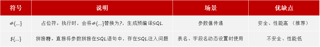 字段参数传递推荐用#{},其他表名参数等不得不用 ${},但也要慎用,存在SQL注入问题