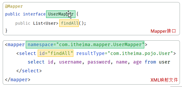 XML映射文件的名称与Mapper接口名称一致,并且将XML映射文件和Mapper接口放置在相同包下(同包同名)。