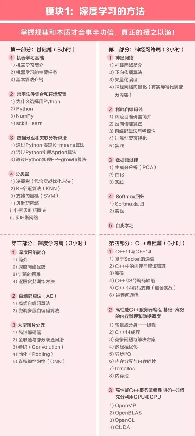 工欲善其事,必先利其器,好高骛远不可取,在基础中兜兜转转不可取,这门课程会帮你打好扎实的基础,课程设计共 5 部分,基础篇、神经网络篇、深度学习篇、C+ + 编程篇和实战篇,每一部分里涉及到的数学和编程都会详细讲解,每一部分都设计了足够的时长,整个课程共 60 课时。