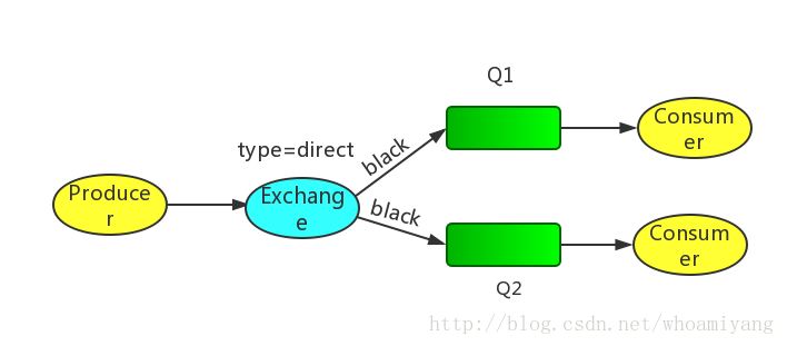 多个queue绑定同一个key也是可以的,对于下图的例子,Q1和Q2都绑定了black,对于routing key是black的Message,会被deliver到Q1和Q2,其余的Message都会被丢弃.