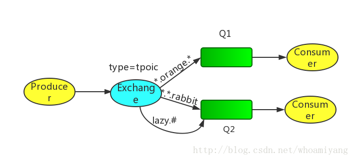 当Producer publish key是orange时,exchange会把它放到Q1上,如果是black或green就会到Q2上,其余的Message被丢弃.