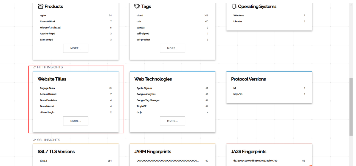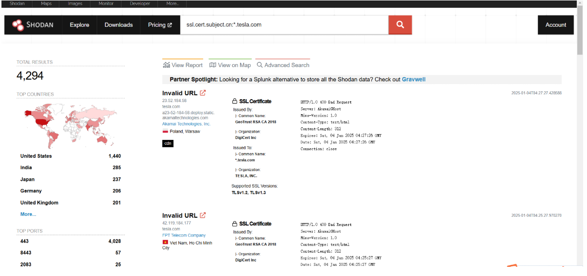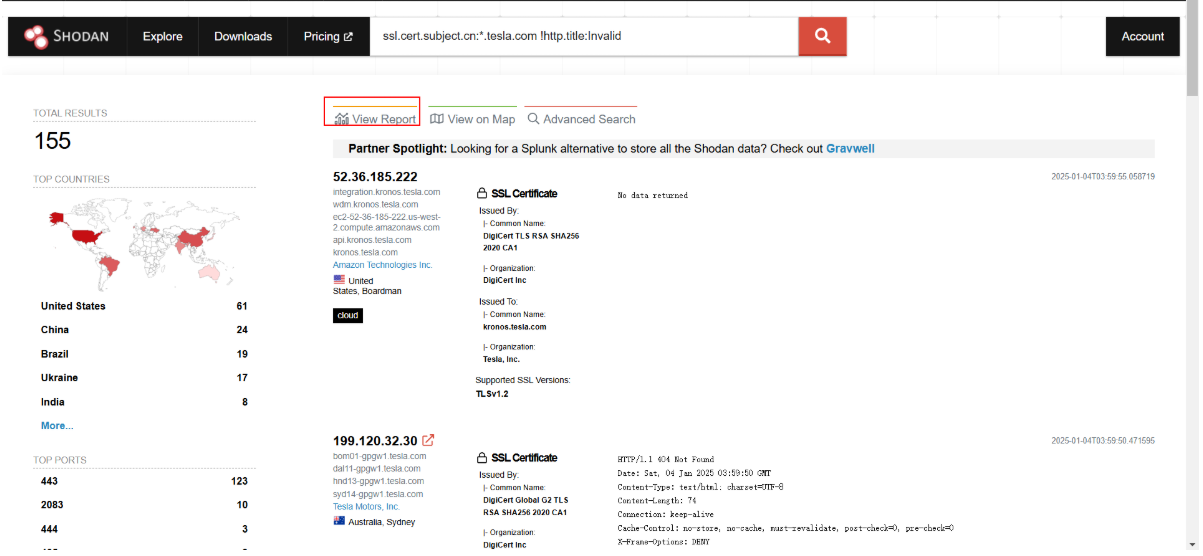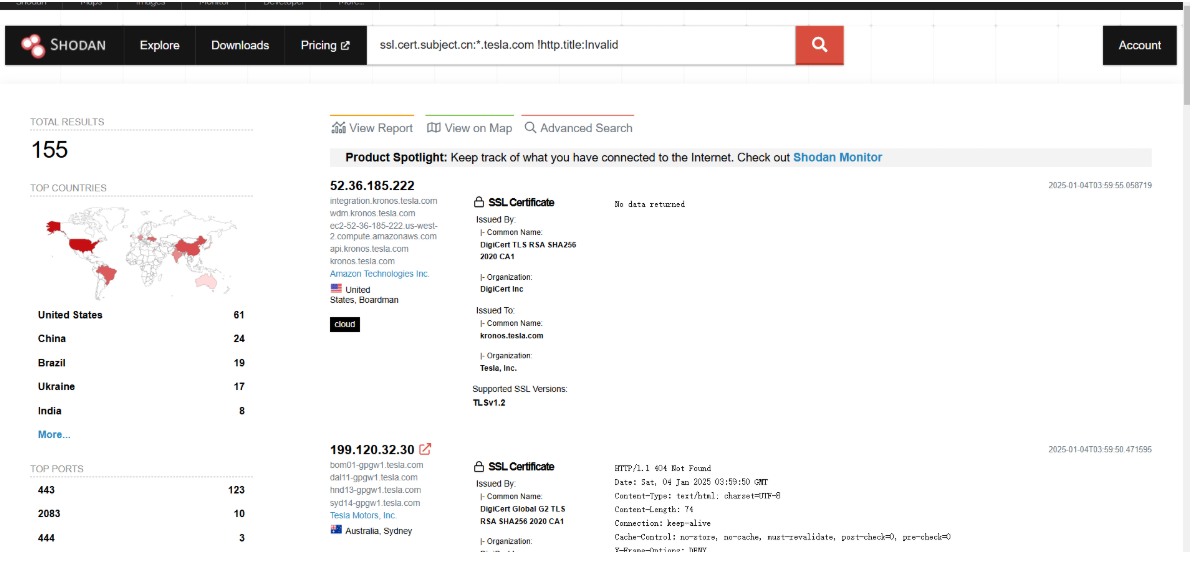 通过ssl.cert.subject.cn:*.tesla.com 在 搜索特斯拉的资产