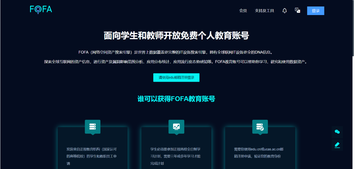 如果是学生或者老师也可以通过学校邮箱注册会员账号https://fofa.info/SchoolRegister