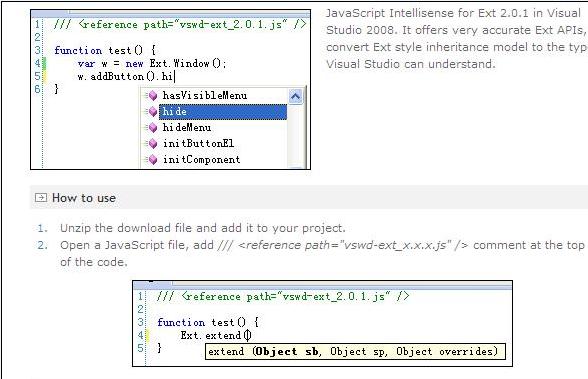使用方法比在VS2008中加入ExtJS智能提示方法一要简便很多,只需要在你编写ExtJS代码的第一行加上js插件的引用路径即可达到效果。