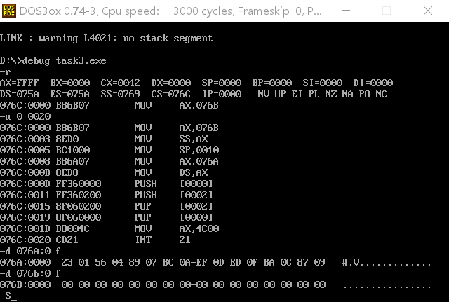 3.实验任务三:将task3.asm程序编译、连接,用debug加载、跟踪,然后回答问题