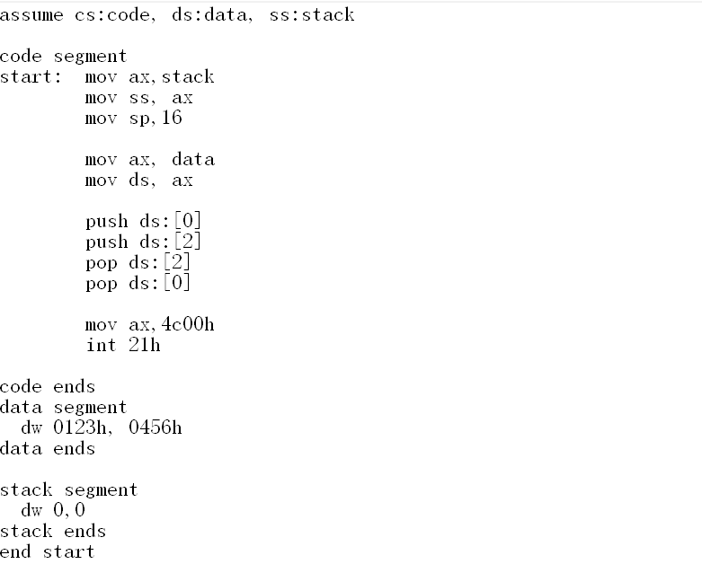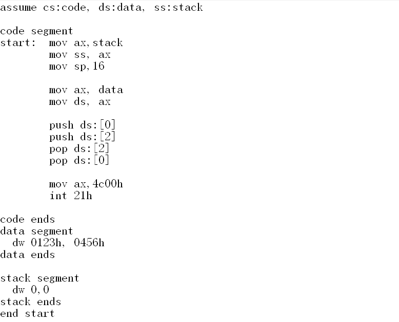 设程序加载之后, code段的段地址为X,则data段的段地址为X-1,stack段的段地址为X-2