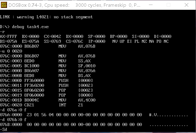 4.实验任务四:将task4.asm程序编译、连接,用debug加载、跟踪,然后回答问题