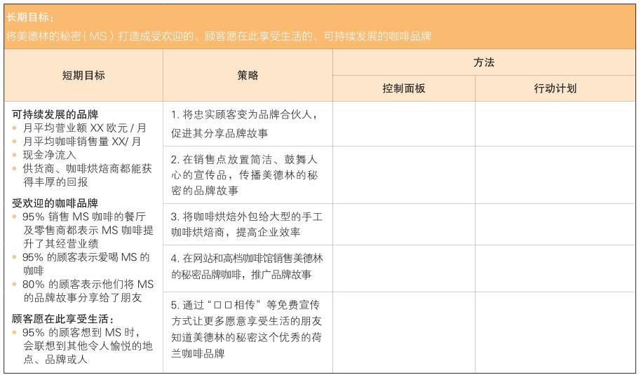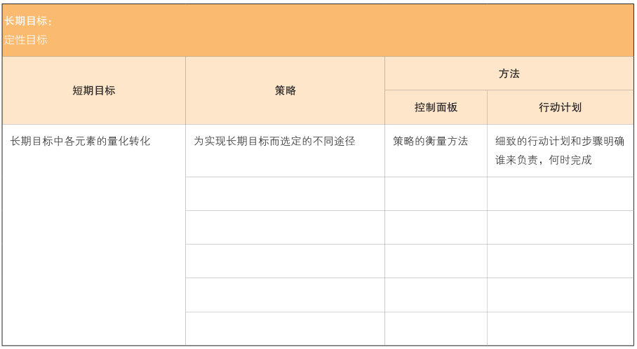 方法包括控制面板和行动计划两部分。控制面板用来检查策略是否走对了路,是否能促成目标的实现。行动计划将策略转化为具体的行动方案,明确每项行动的执行人以及完成时间。长期目标和短期目标共同定义了预期目标,而策略和方法则明确了实现方式。这样一来,长期目标的实现便落实到了日常工作中。