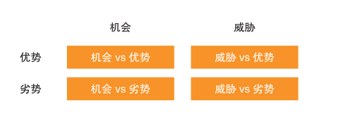 SWOT 分析可以帮助你确定企业的定位,而对持矩阵可以帮你更好地利用 SWOT 分析。如果你能用对持矩阵法列出如下组合,你就能利用优势去抓住机会,或者消除弱势以解除威胁。