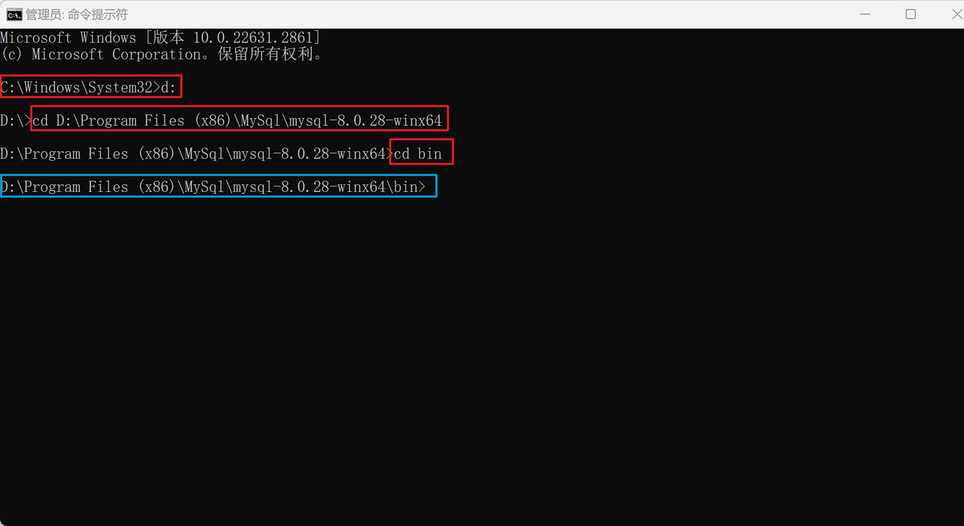 注意:一定要以管理员身份运行cmd,进入mysql的bin目录下: