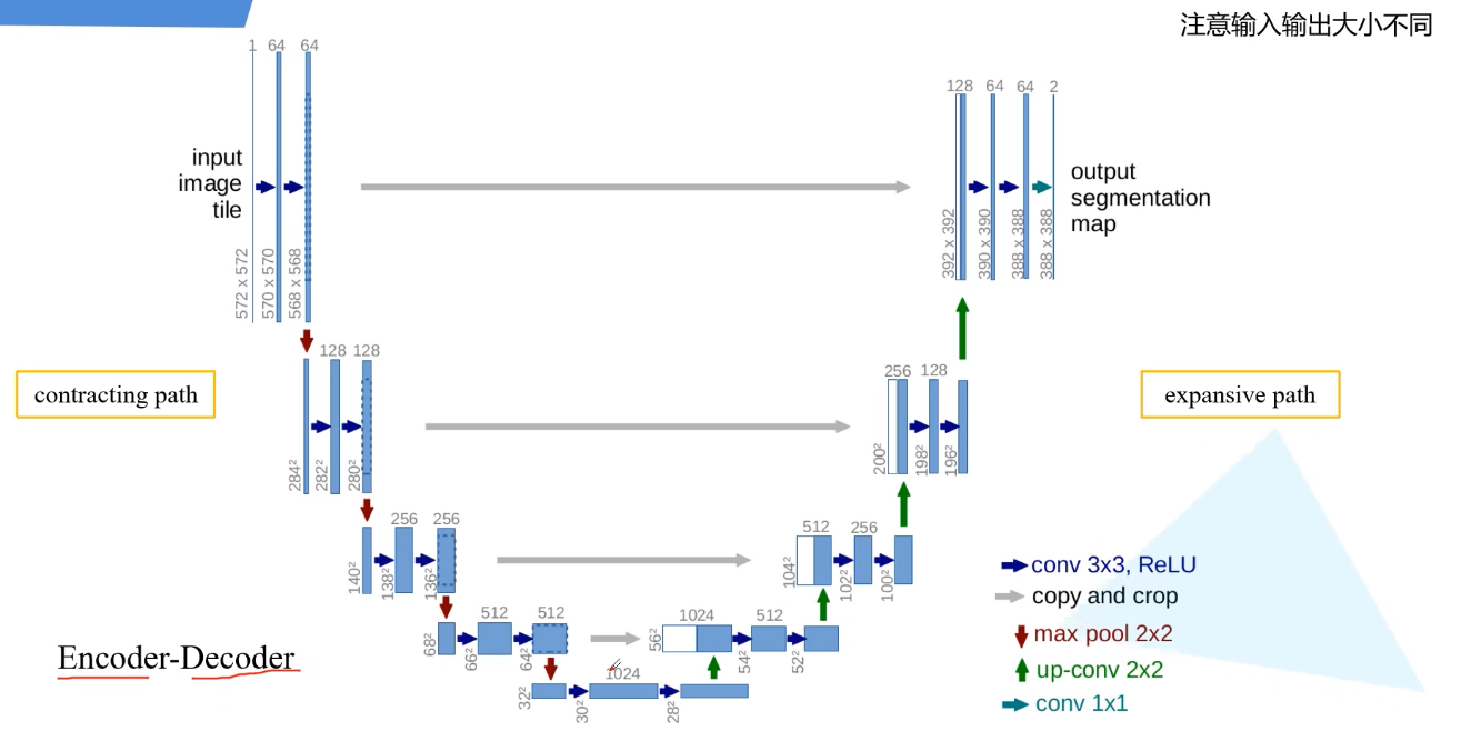 从输入开始看,输入是572x572的单通道的图片为例,首先进行一个卷积操作(步距为1,no padding)通过卷积层之后,高和宽都会减少,当时15年还没有BN。经过两个卷积层后进行下采样(max poooling),2x2,高和宽就会减半,channel不会变化,还是64。接着再进行两个3x3卷积层,(每次下采样后都会将channel进行翻倍,64-128)。右半部分:绿色的是上采样(其实是转置卷积,可回看视频,经过之后会将特征层的高和宽放大两倍,channel减半),1024-512,对应蓝色部分;灰色箭头是copy和crop,左边的高和宽是64x64,右边得到的是56x56大小的,无法进行直接拼接,所以对左边的特征层进行中心裁剪,和右边的蓝色部分进行拼接,拼接之后channel为1024。后面依次进行上采样。直到最后得到宽和高388x388,最后经过一个灰色的箭头卷积层,这个卷积核的个数和我们分类的类别个数是一致的,论文中只分割前景和背景。输出的结构就是388x388x2。(注意最后1x1的卷积的没有激活函数)