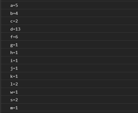 var str = "aabbcdfghijkladfwdfdslmdsfdaadddfdfbbcddd"; function dealStr(str) { var obj = {}; for (var i = 0; i < str.length; i++) { var v = str.charAt(i); if (obj[v] && obj[v].value === v) { ++obj[v].count } else { obj[v] = { count: 1, value: v } } } return obj; } var obj = dealStr(str); for (key in obj) { console.log(obj[key].value + '=' + obj[key].count); }