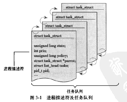 内核把进程的列表存放在叫做任务队列的双向循环链表中,链表节点为进程描述符:
