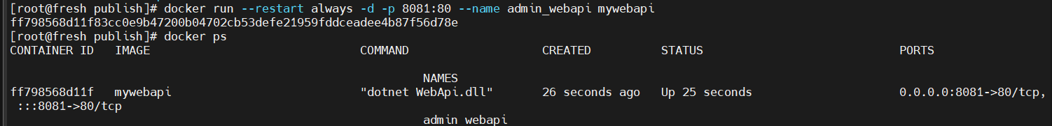 - docker run-- restart always -d -p 8081:80- -name webapi webapi