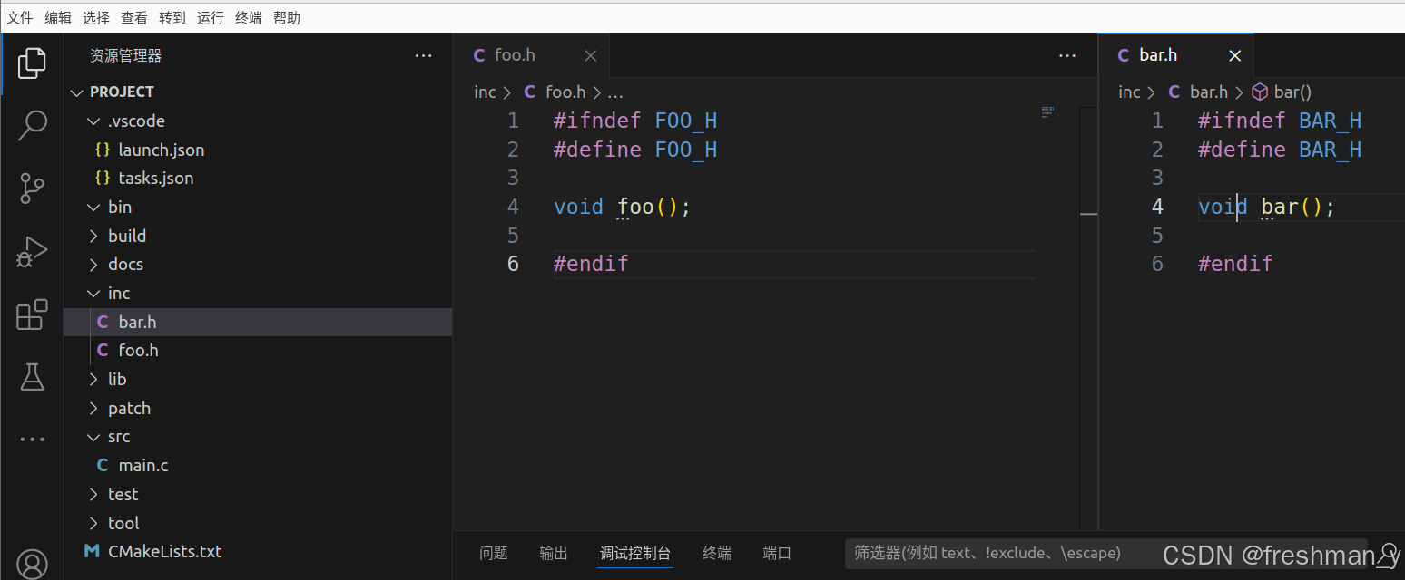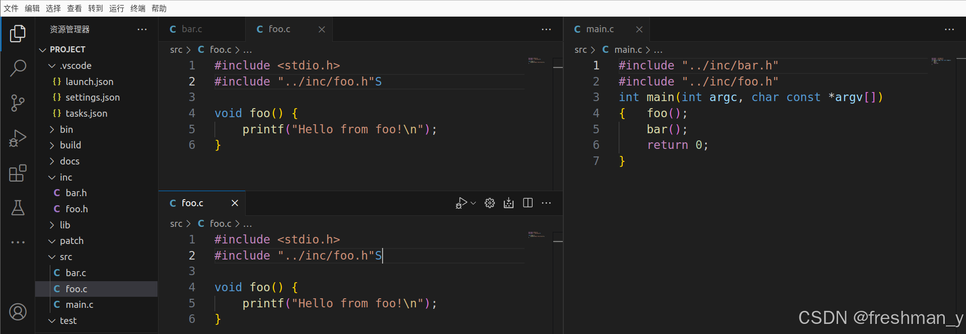 同时在src写对应的实现文件bar.c和foo.c ,修改main.c 文件内容如下(调用函数)