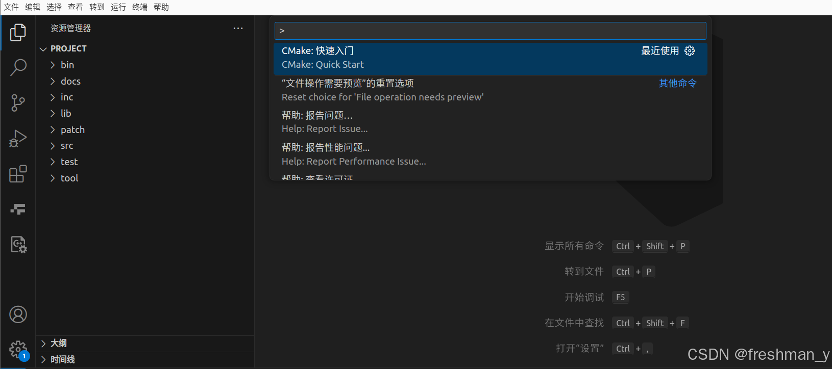 3、按 ctrl+shipt+p 显示所有命令,接着输入cmake,点击 CMake:快速入门