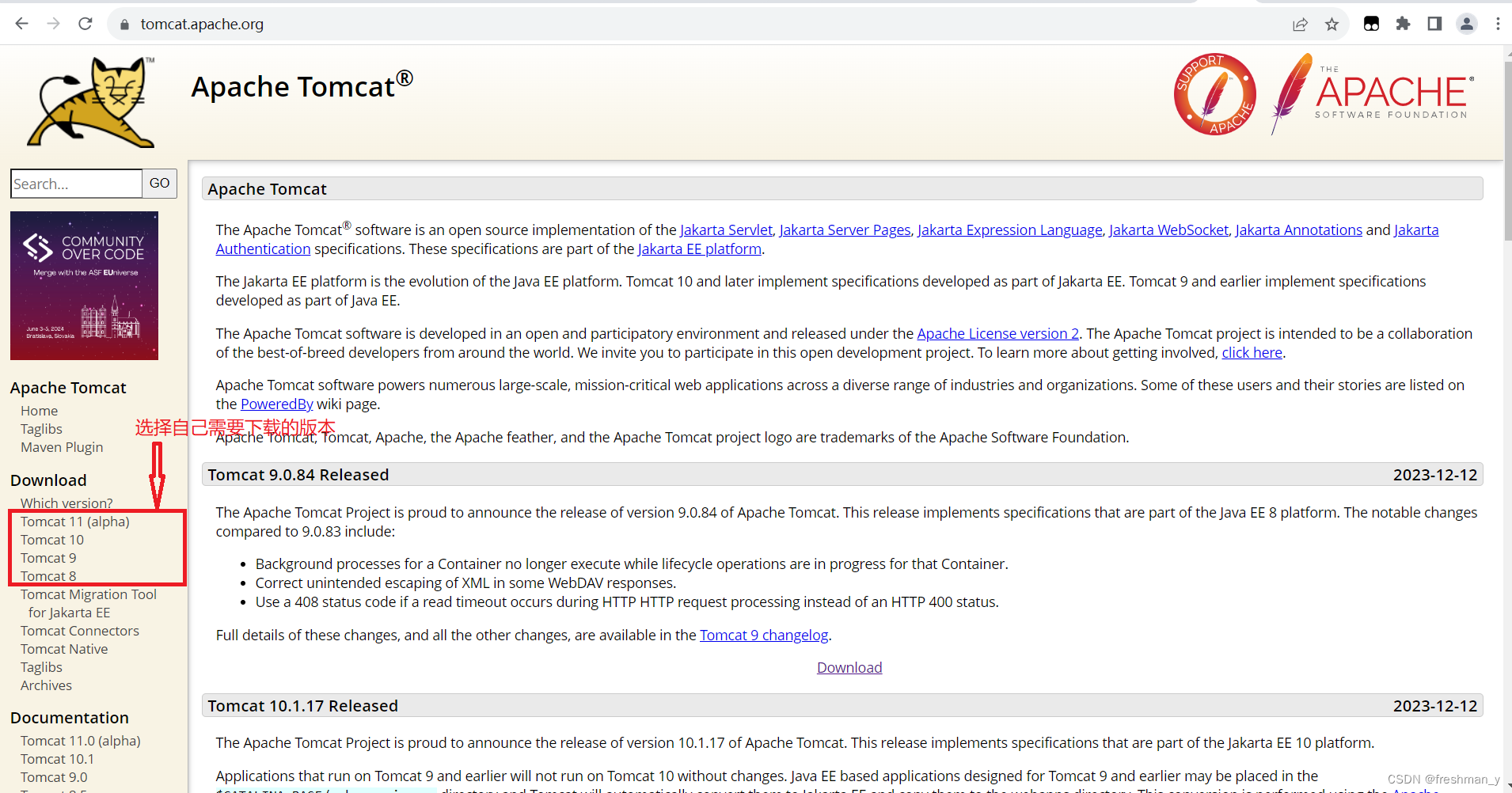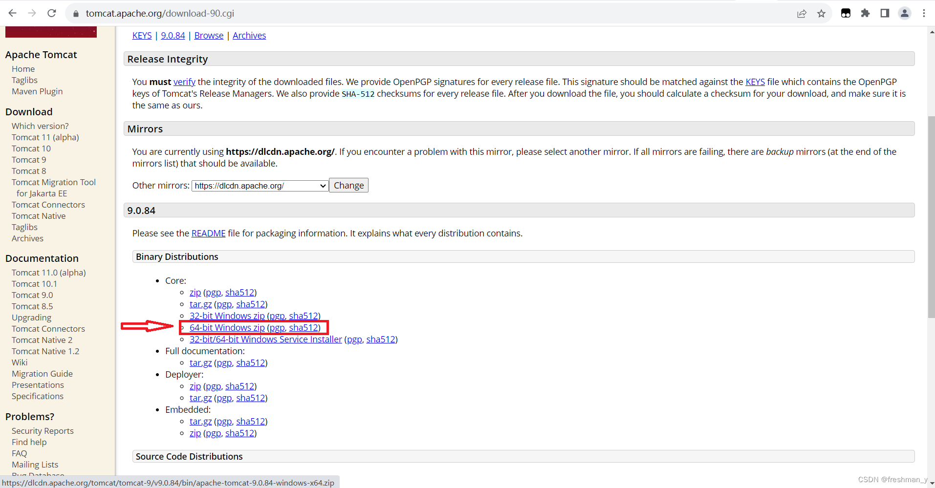 2、 这里以tomcat 9 为例,选择如下64-bit Windows.zip 进行下载