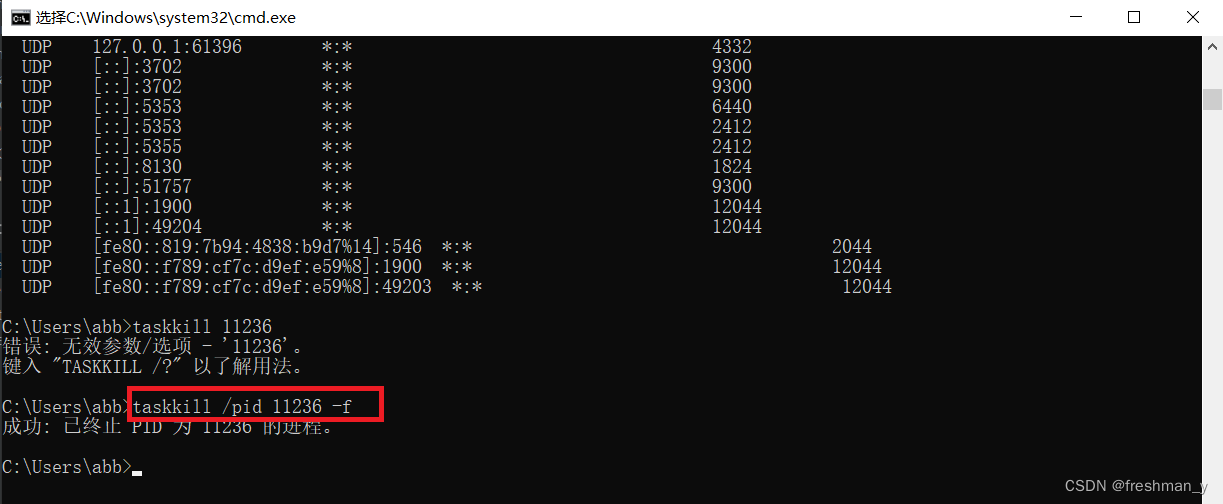 3、输入taskkill /pid 11236,强制杀掉这个PID
