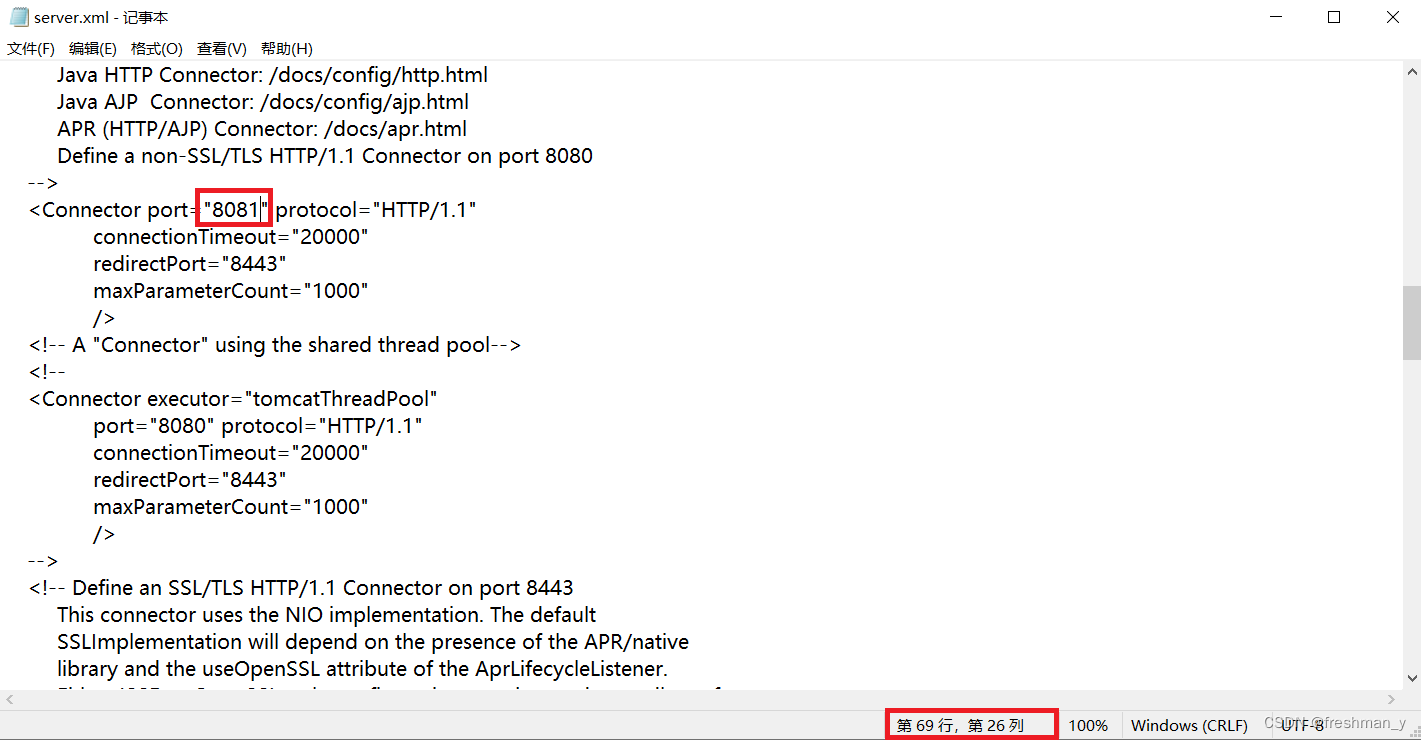 4、 8080是默认端口号,如果和其他软件冲突,去配置文件中server.xml中修改端口号即可。(3没问题直接跳过此步)