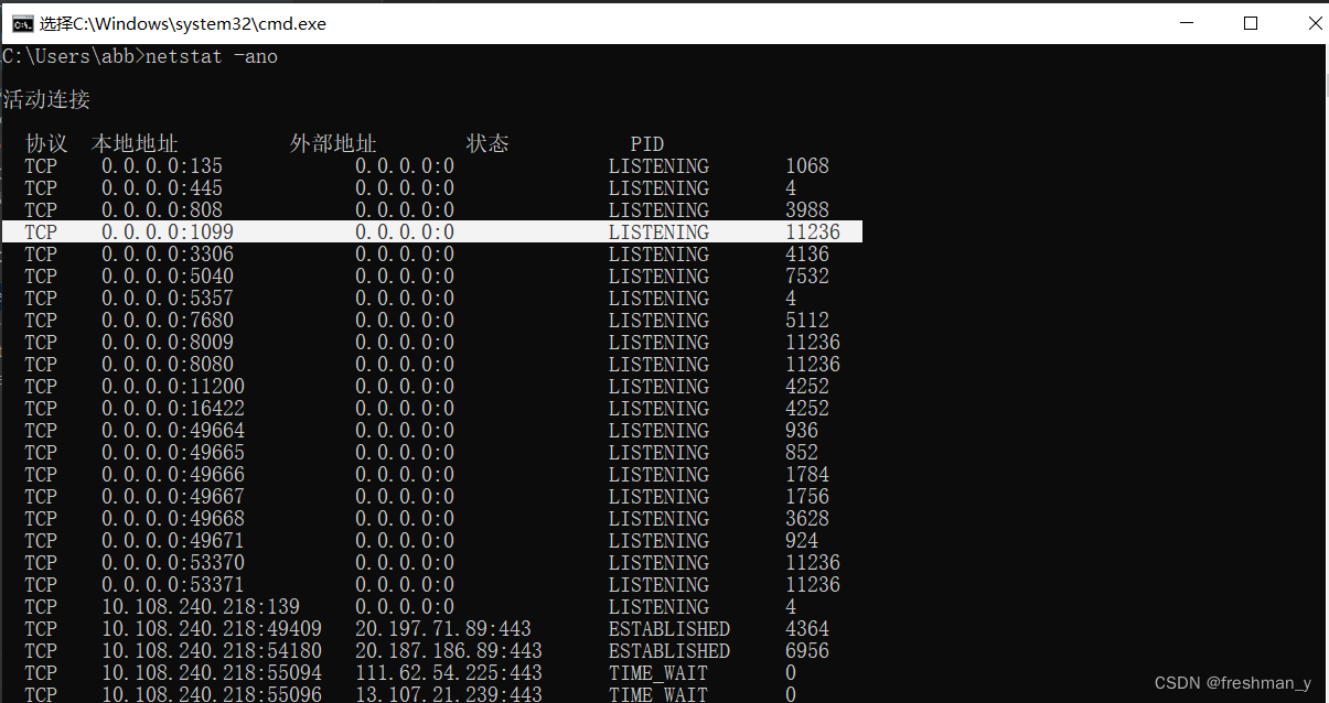 2、打开cmd窗口,输入 netstat -ano 关注本地地址1099对应的PID11236