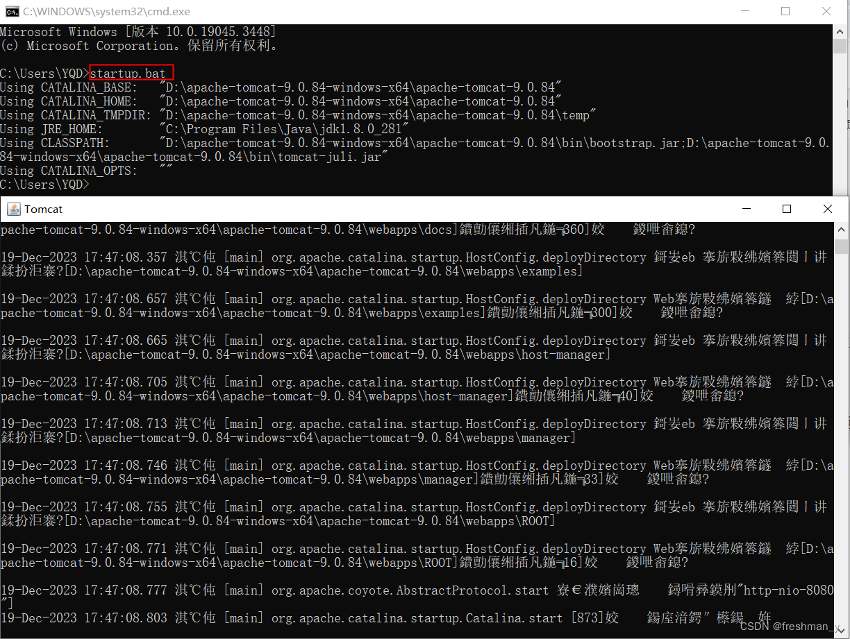 3、重新打开cmd窗口,输入startup.bat可以看到解决了乱码问题,而且可以直观地看到默认端口号8080和启动状态。