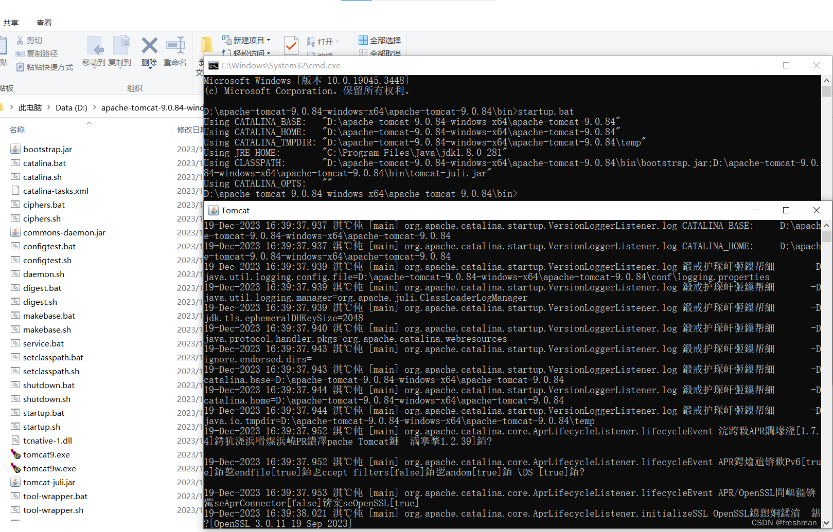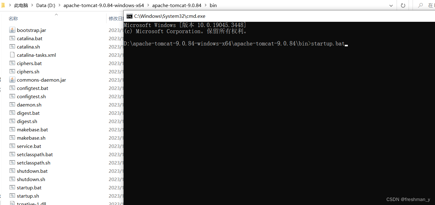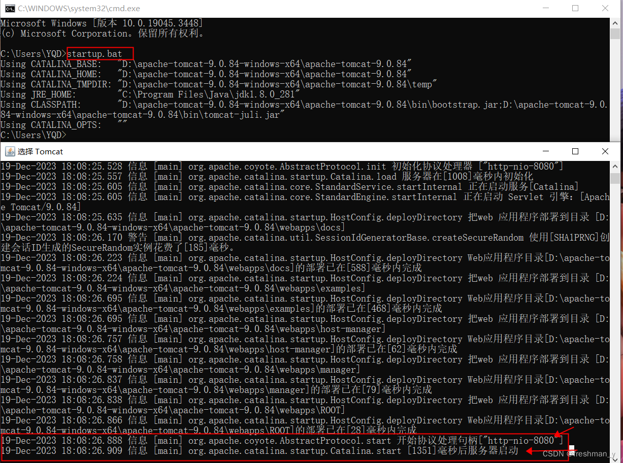环境变量配置好之后,打开cmd命令窗口(win+R,输入cmd)回车,输入startup.bat回车,看到一大串东西应该就没啥问题了,也可打开游览器输入http://localhost:8080进一步验证。