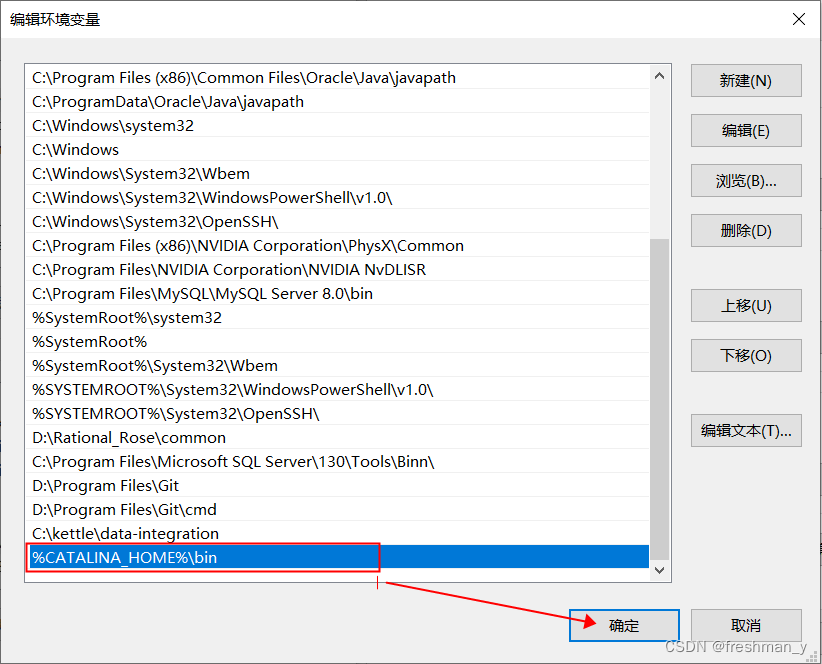 2)找到系统变量Path,双击空白处或者点击新建即可,写入%CATALINA_HOME%\bin即可