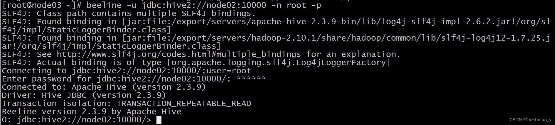 beeline -u jdbc:hive2://node02:10000 -n root -p