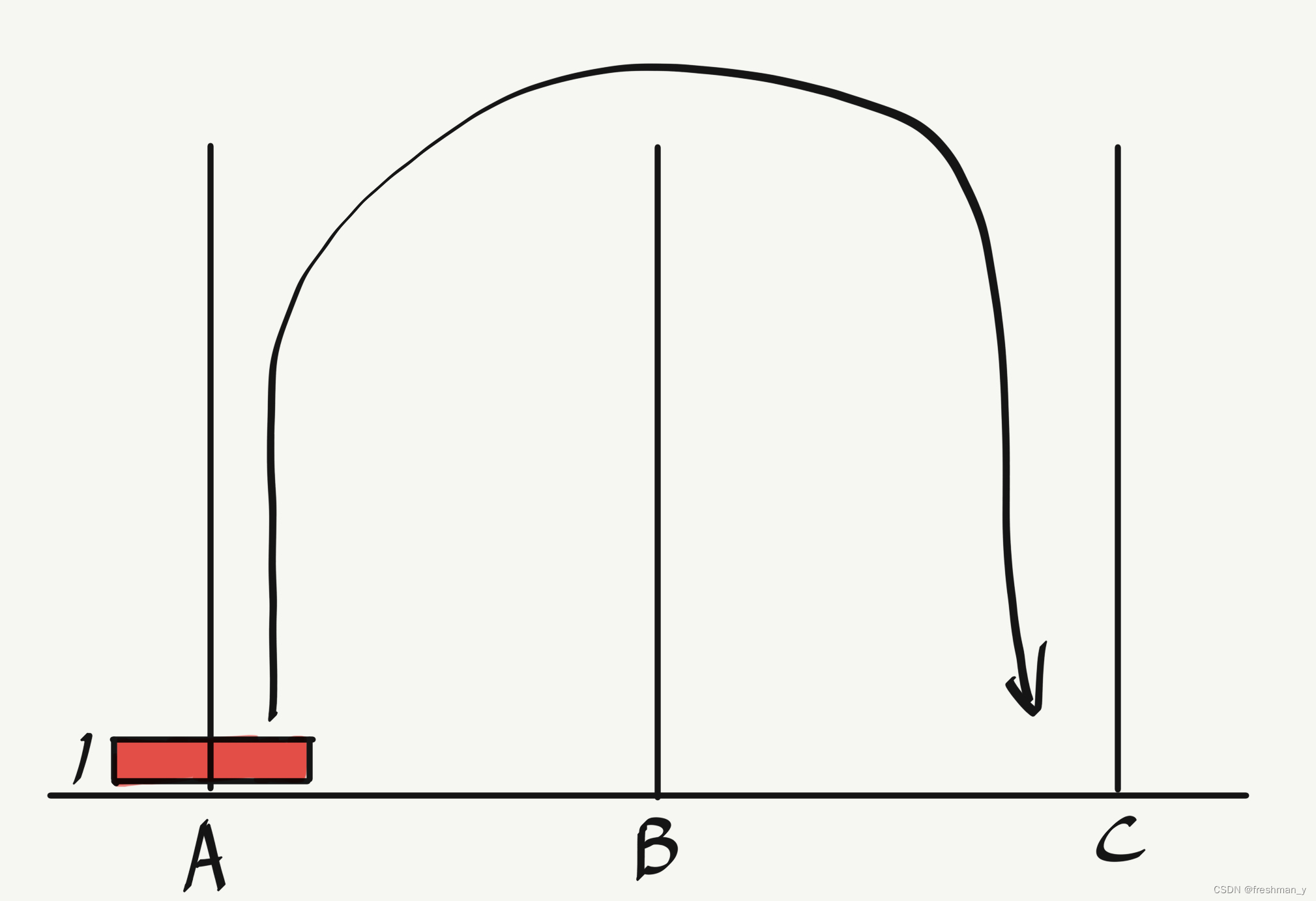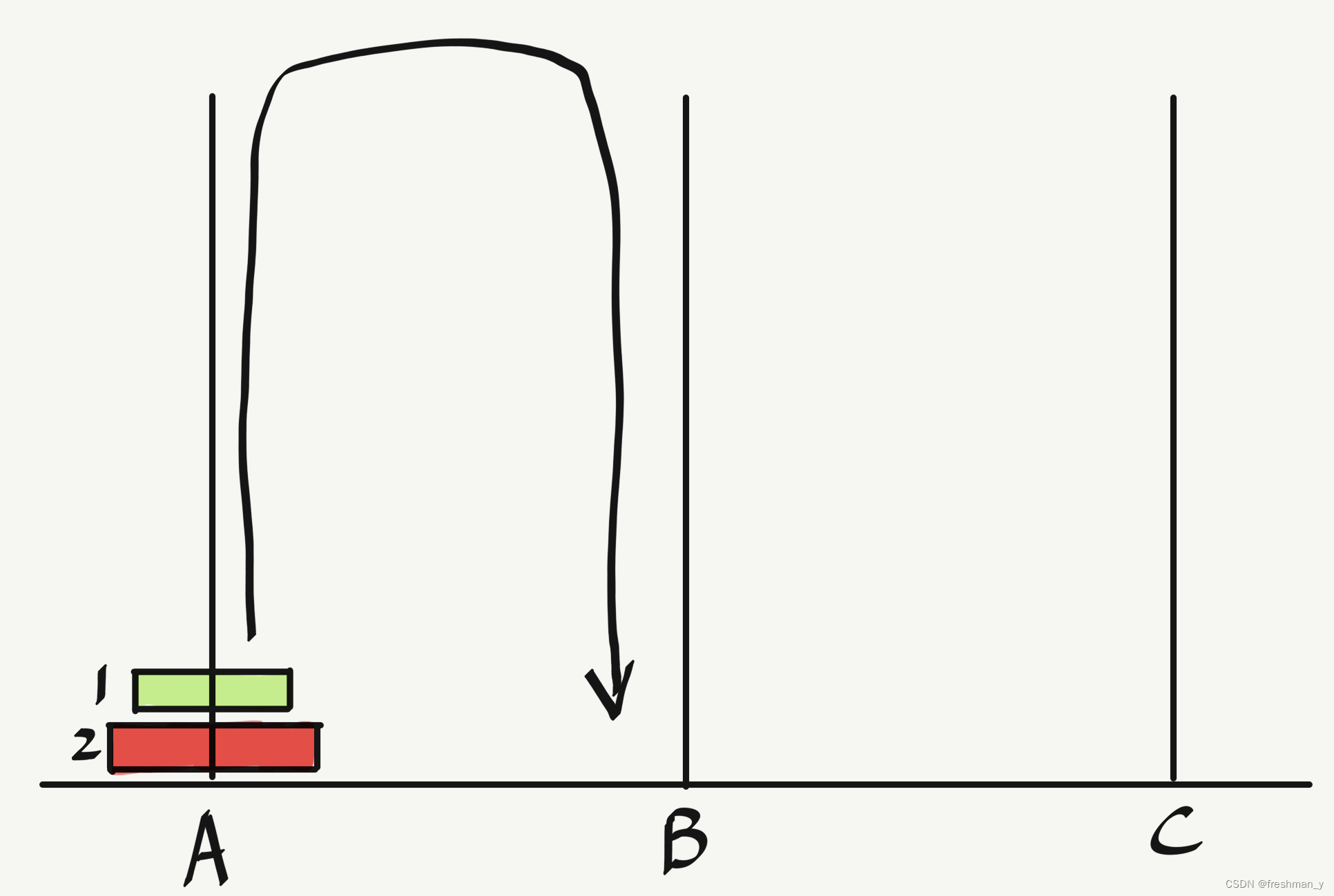当汉诺塔的层数为1时很简单,直接从起始位置A到目标位置C。