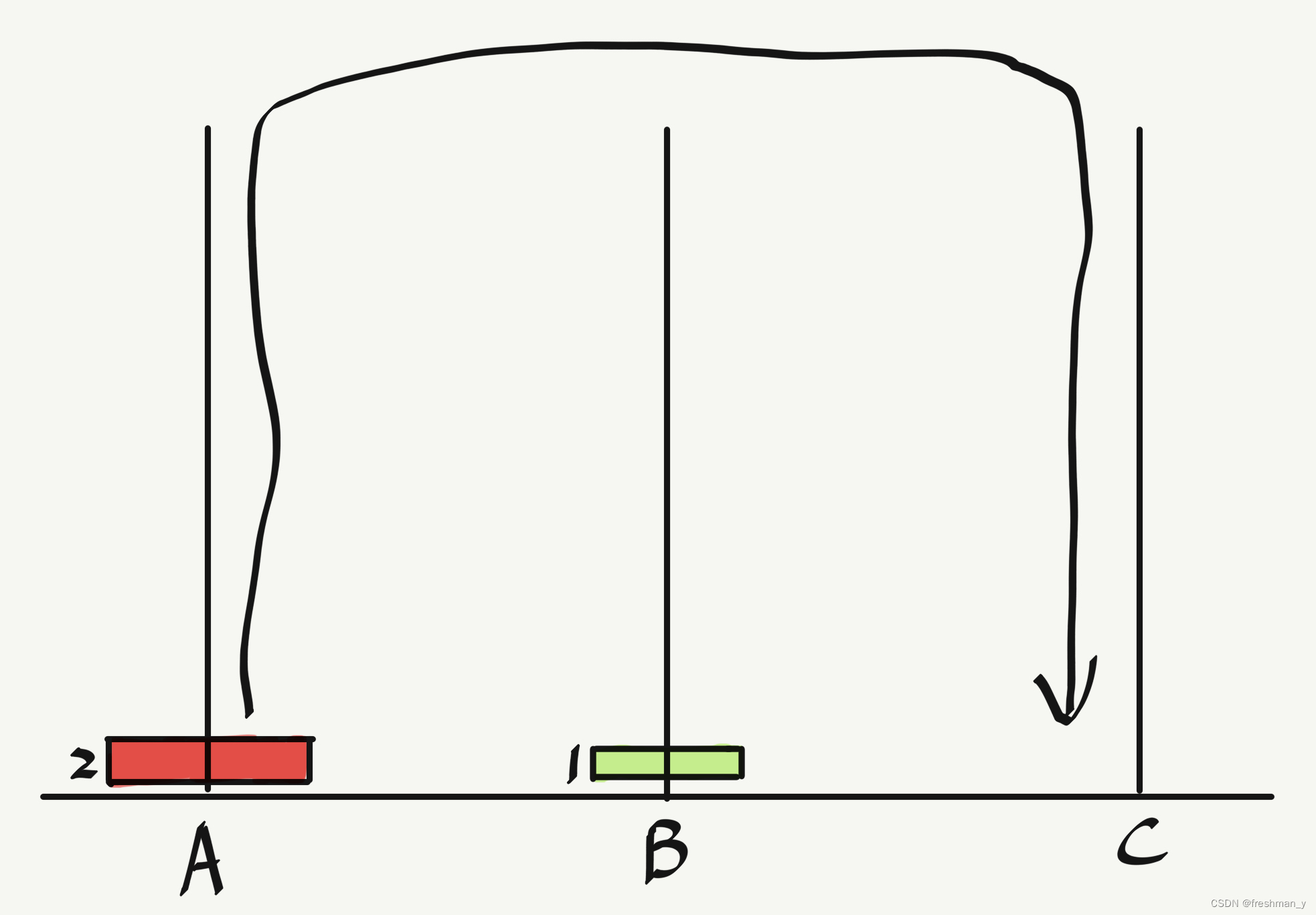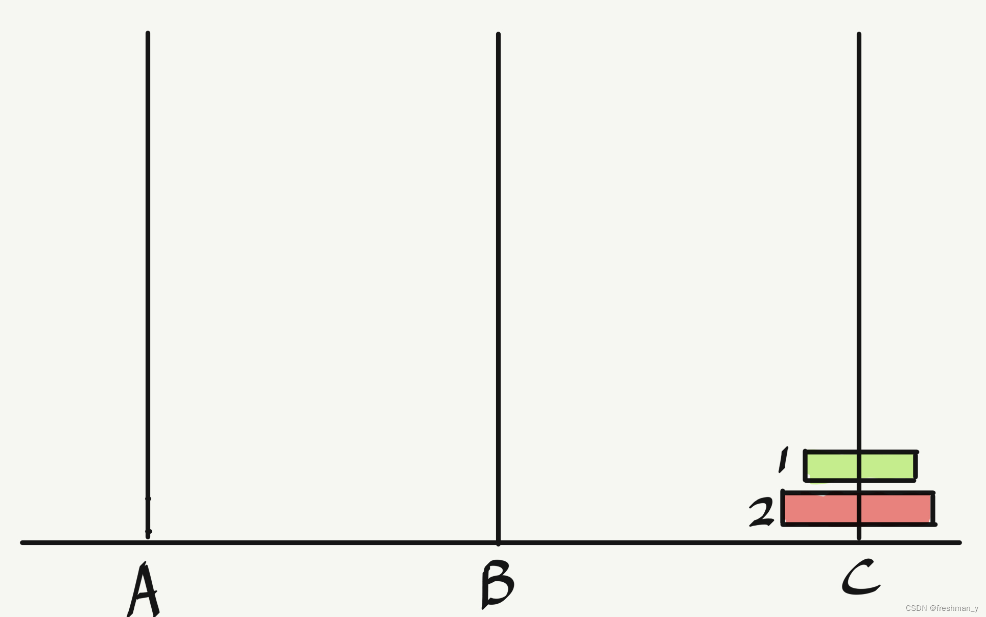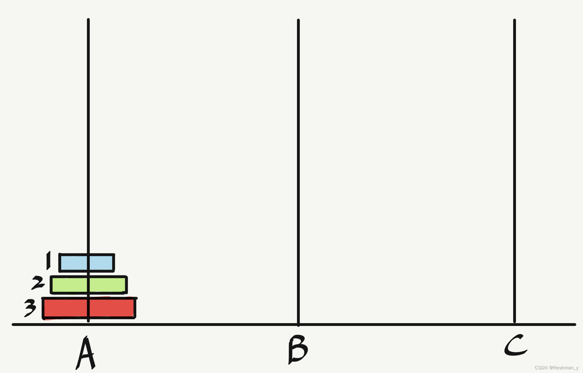 我们来思考一下,要想把3个圆盘从A移到C,首先需要把3号上面的圆盘1和2移到B,这样3号才能直接到C。
