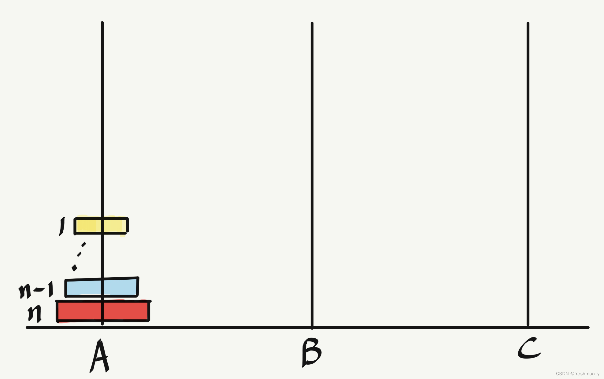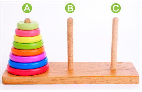目前A上有n个圆盘,我们要把它们移到C上。这个其实也只需要3步:第1步,把A中从1到n-1个圆盘移到B;第2步,把A中剩下的第n个圆盘移到C;第3步,把B中的n-1个圆盘移到C。至于如何把n-1个圆盘移到B,那就相当于重复我们上面的步骤,直到递归到我们熟悉的2个或3个圆盘所需的移动步骤。