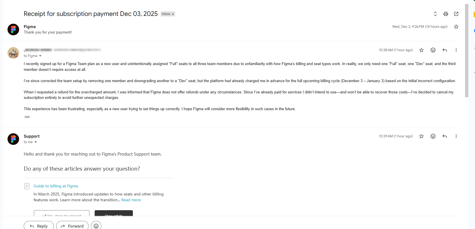 I would like to request a refund. Yesterday, the platform charged me in advance for the upcoming billing cycle (from December 3 to January 3 of next year). As a new Figma user, I wasn’t fully aware of how the platform works, which led to all three members of my Figma Team being assigned the "Full" seat type. However, we actually only need one "Full" seat, one "Dev" seat, and the third member doesn’t require a seat at all and can be removed from the team entirely.