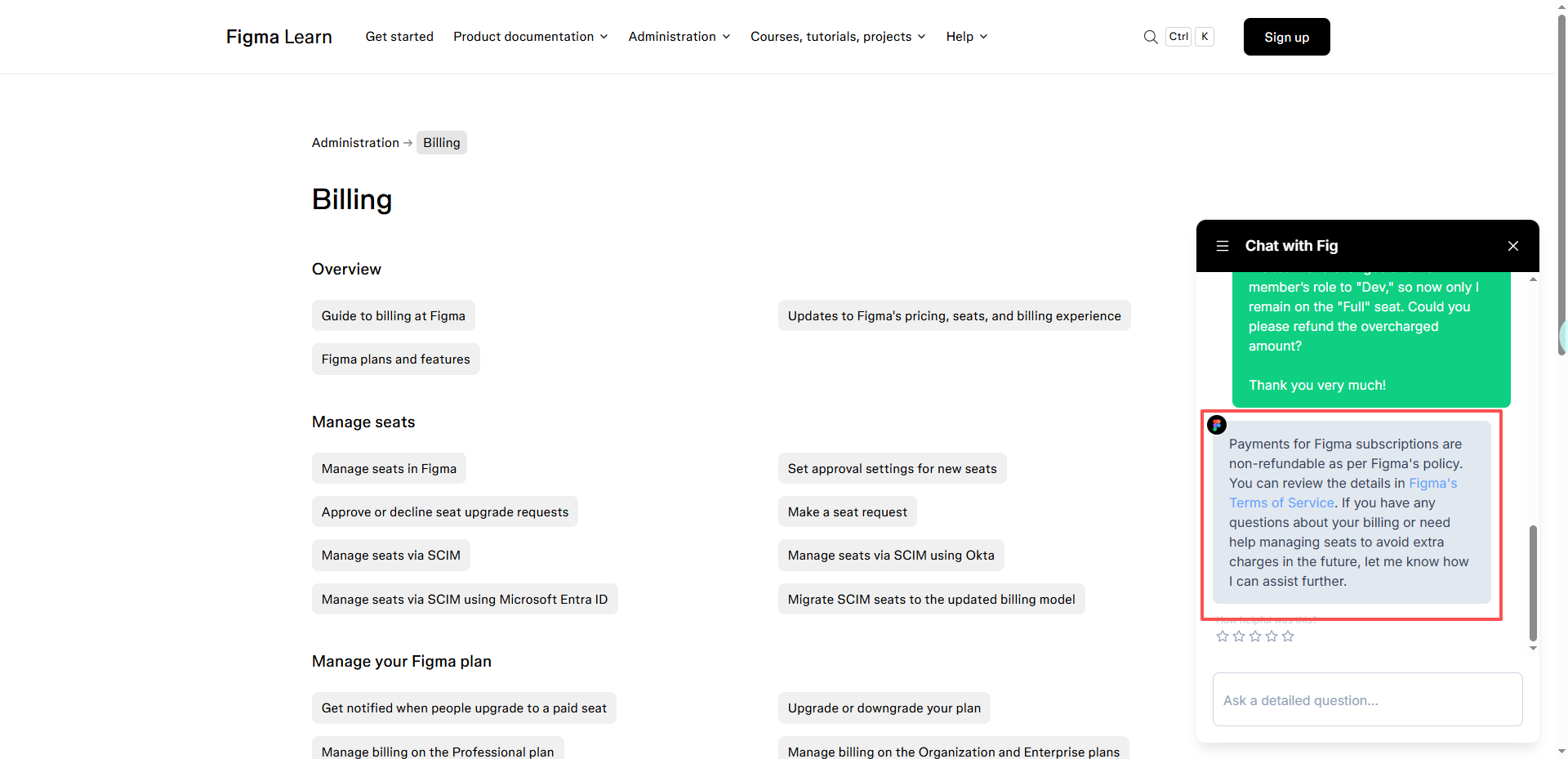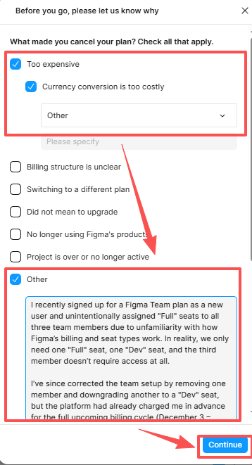 When I requested a refund for the overcharged amount, I was informed that Figma does not offer refunds under any circumstances. Since I’ve already paid for services I didn’t intend to use—and won’t be able to recover those costs—I’ve decided to cancel my subscription entirely to avoid further unexpected charges.