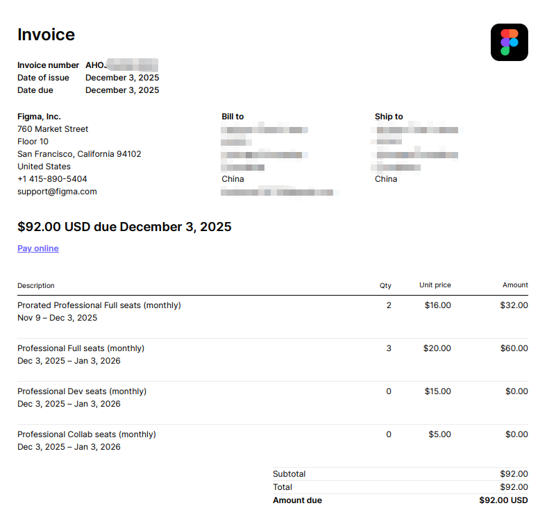 可是我是 Figma 新手没有注意到一些细节,后续邀请进入的小伙伴全是 Full 角色,所以就导致 20*3=60 美元的预付,上个月不是完整的月份按照比率折算的两个席位 16*2=32 美元。