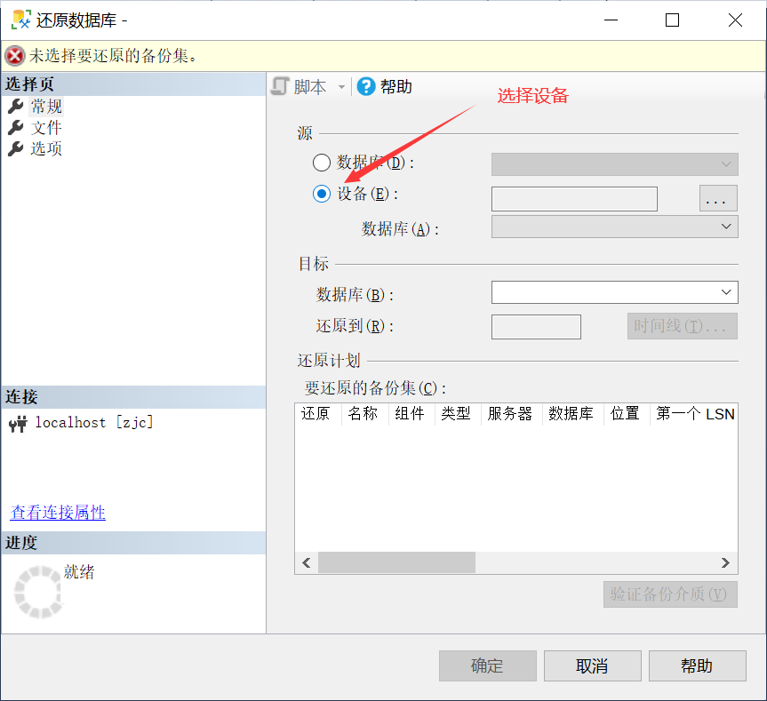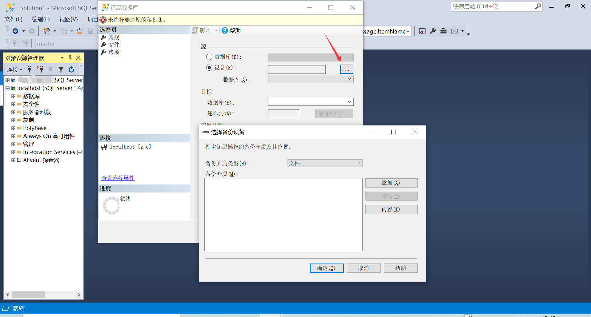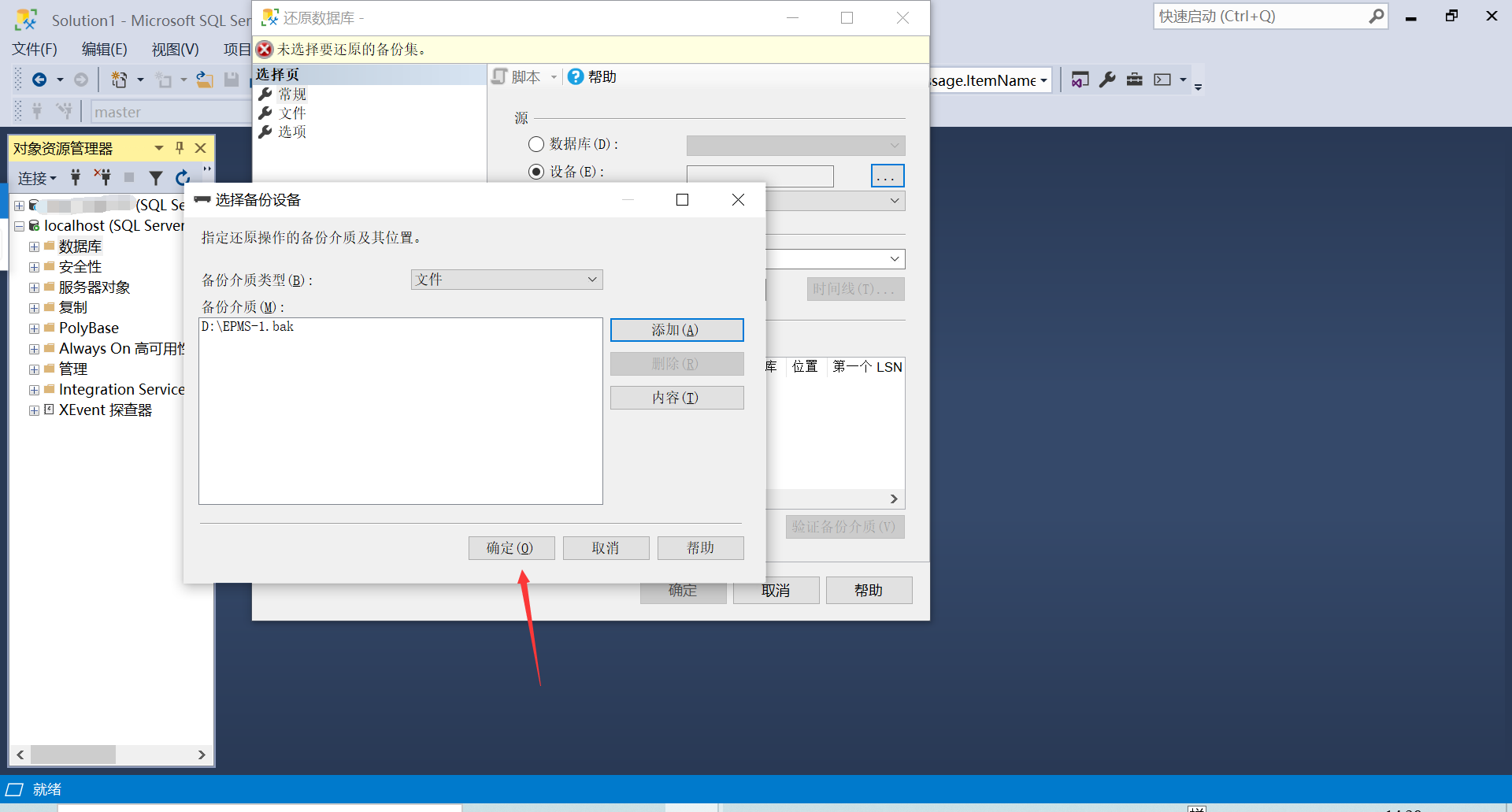 4,点击添加按钮,选择要还原的.bak备份文件,选择完之后点击确定