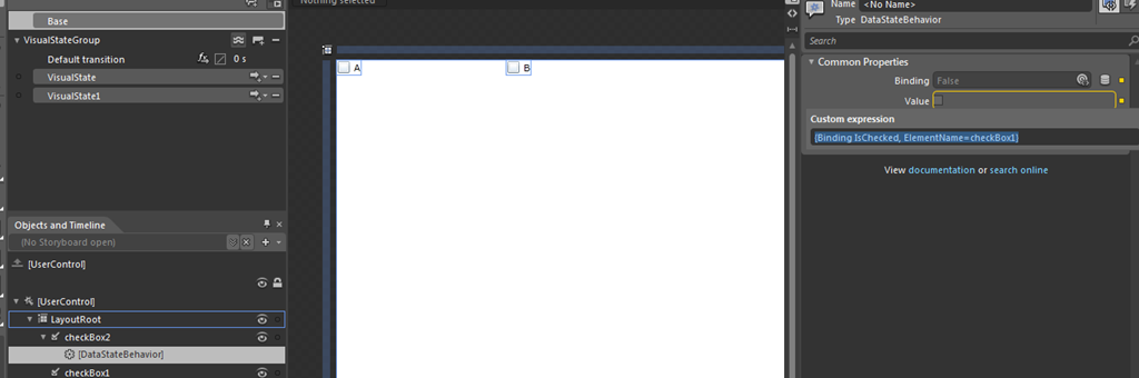 在上图中,DataStateBehavior 附加在A复选框上,DataStateBehavior 的Binding属性绑定了A复选框的IsChecked属性,Value属性绑定了B 复选框的IsChecked属性,当两个复选框IsChecked 属性状态相同时,界面会显示VisualState,否则显示VisualState1
