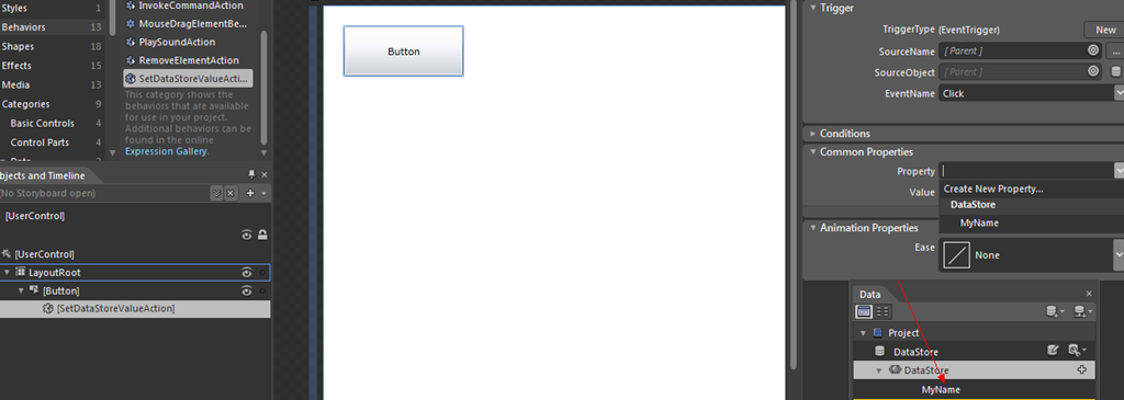 在上图中,点击Button 就会修改你再Data面板中设定的数据项对应的值。