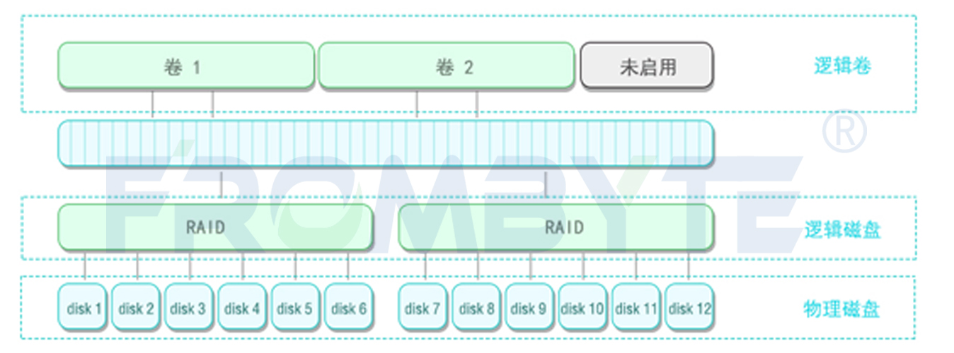 该LeftHand存储中有三组raid,两个卷,12块物理硬盘。