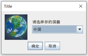 Object object = JOptionPane.showInputDialog(null,"请选择你的国籍\n","Title",JOptionPane.QUESTION_MESSAGE,new ImageIcon("D://地球.png"),options,"中国");